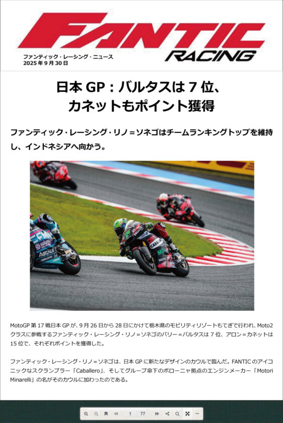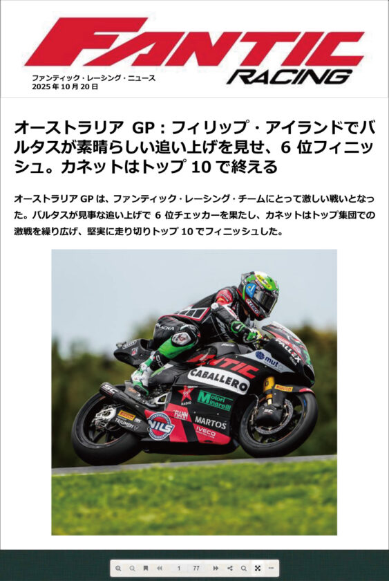 IT ALL BEGAN WITH Scroll MOTOR CYCLES LINE UP NEWS Touch the FANTIC 2025年10月22日NEWSクラスを超えた走行フィーリング&質感を持つイタリアン・ネイキッドスポーツ「STEALTH125」試乗インプレッション。2025年10月21日Fantic RacingMoto2世界選手権。オーストラリアGP、フィリップアイランドでバルタスが魅せた!2025年10月7日Fantic RacingMoto2世界選手権。ファンティック・レーシング、マンダリカで躍進!2025年10月1日Fantic RacingMoto2世界選手権。ファンテイックレーシング・リノ=ソネゴ、チームランキングトップを維持2025年9月24日Fantic RacingMXGP世界選手権。FANTICとコルデンホフ、2025年度MXGP年間3位に輝く!2025年9月16日Fantic RacingMoto2。サンマリノGP:バルタスが優勝目前の2位、カネ ットは7位でゴール ! / MXGP。コルデンホフ、25シーズンランキング3位を確保! HISTORY Fantic Motorの歩み Read more DEALERS Fantic/Caballero取扱店一覧 Read more CONTACT お問い合わせ Read more COMPANY 会社概要 Read more
