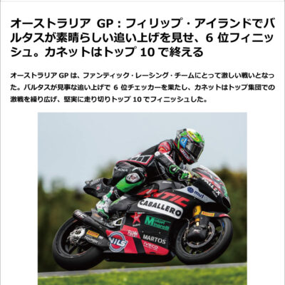 「イタリアGPでダブル優勝という、完璧なシーズンスタートを切ることができたわけだけど、今は、集中して次のレースのことを考えなければと思っているよ。まずはアッソルーティと、そして世界戦第2戦となるスペイン戦に向けてね。」